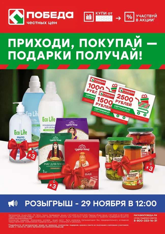 Совершите покупку в магазине ПОБЕДА на определённую сумму* в период с 14.11.2025 по 28.11.2025 года включительно. Получите на кассе чек-анкету и заполните свои контактные данные. Затем опустите чек в специальный ящик и участвуйте в розыгрыше подарков.