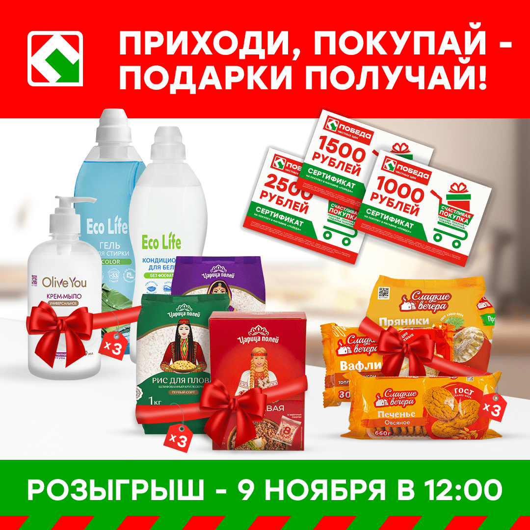 Участвуйте в “Счастливой покупке” и выигрывайте полезные подарки от магазинов ПОБЕДА!